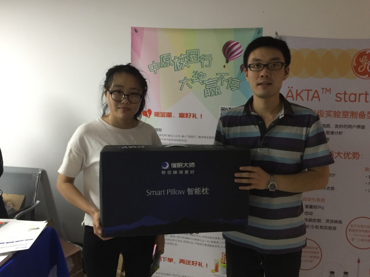 此次“中原校园行”活动我们准备了丰富的礼品。最后,一等奖——智能记忆枕,由天津大学生命科学学院的一位老师抽出。