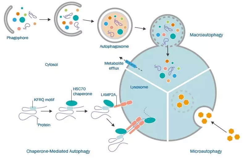 自噬是将大分子和细胞器转运至溶酶体,使其降解和回收再利用的过程。这一过程的目标是消除过量或有缺陷的细胞器以及聚集的衰老蛋白。在水解之后,基本的分子原件被回收到细胞质中,作为细胞的组成材料或能量来源。因此,自噬在细胞内稳态机制中起着关键作用,控制着细胞的可用资源和能源消耗之间的平衡。