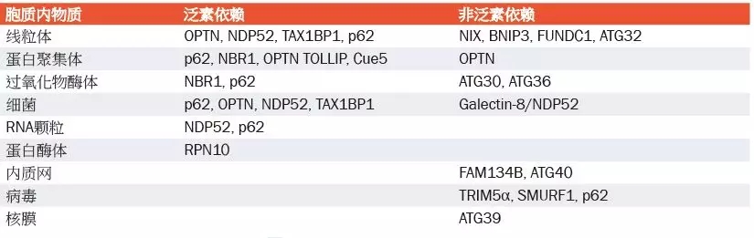 选择性自噬受体的类型:选择性自噬通路被广泛地归类为非泛素依赖或泛素依赖两种类型,并涉及到衔接蛋白或选择性自噬受体,直接或通过泛素与细胞靶点相互作用。
