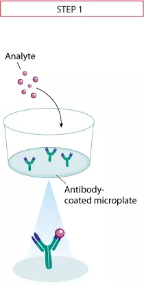 第一步:向包被有捕获抗体的微孔板中加入样品或标准品,孵育使分析物与包被的抗体结合,将未结合的其他分子清洗掉。