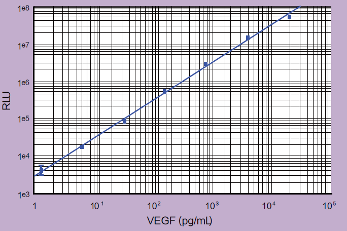 结果:显示由 SpectraMax® L 微孔板化学发光酶标仪按照上述的参数所得的 VEGF 标准曲线, 其动态范围超过 4 个数量级,计算所得的检测限,也就是空白对照信号标准差 3 倍值的相应量为 1.5 pg/mL,与该试剂盒平均检测下限为 3.3 pg/mL 相符。